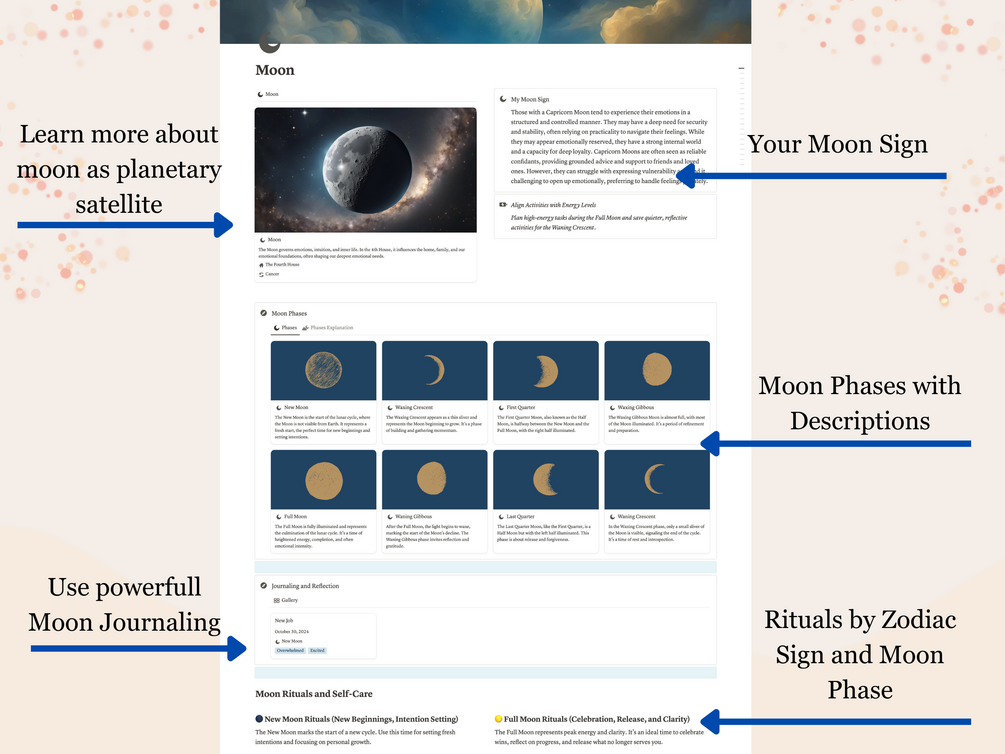 This Notion Astrology Toolkit is designed to make astrology more accessible, organized, and fun. From understanding your personal chart to tracking moon phases and key 2025 cosmic events, everything is set up for you to start your journey immediately.