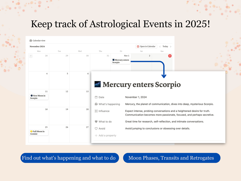 Unlock the mysteries of your chart, align with lunar cycles, and make the most of 2025’s celestial happenings with this Astrology Notion Template. Perfect for anyone wanting a deeper cosmic connection in their daily life!